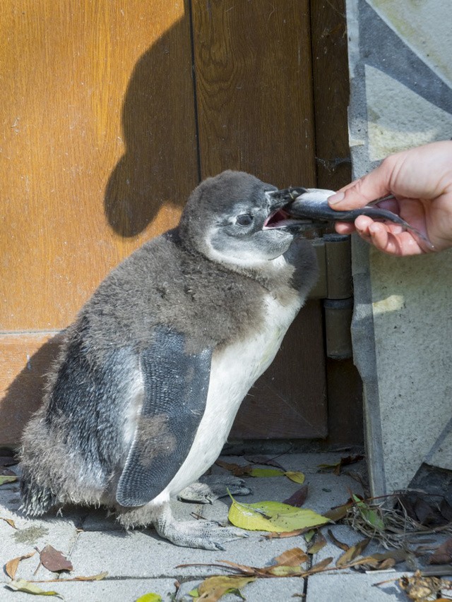 Az elmúlt egy év során is két fióka is felcseperedett a szegedi Vadasparkban./ A legfiatalabb pingvin baba, a szeptember elsején kelt Pöttöm most lépett abba korba, hogy elkezdjék gondozói hozzászoktatni az emberi kézből való evéshez\./