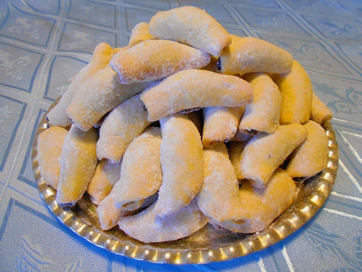 Ezután a rétegelt részre állítva kisodorjuk, nagyon vékonyra. Nagy méretű pogácsa szaggatóval, kiszaggatjuk a tésztát és megtöltjük az előre elkészített töltelékkel. Egy lapocskára 1 kávéskanál töltelék kerül, majd ráhajtjuk a tésztát és kifli alakúra tekerjük.