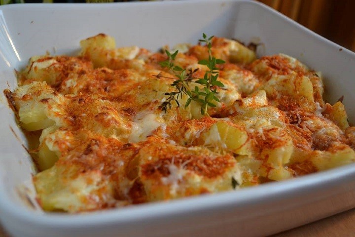 Egy kerámiatálat kivajazunk és ebbe belerakjuk a víztől lecsepegtetett krumplit, majd fűszerezzük frissen őrölt borssal, kakukkfűvel, ízlés szerint sózzuk, és ráöntjük a tejszínt, valamint a tetejére a tejfölt.