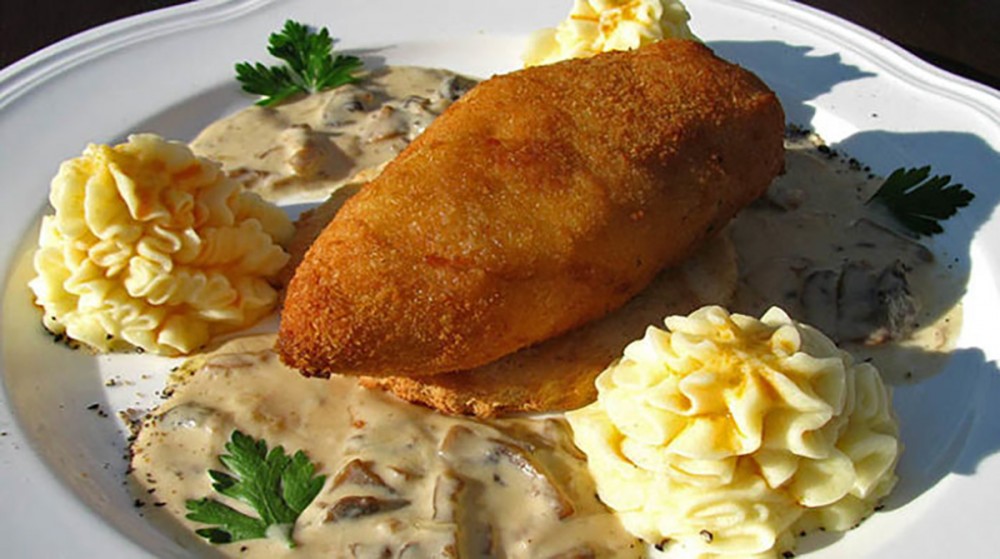 A csirkemellek egyik oldalát bekenjük a vajas keverékkel, mindegyikre teszünk egy szelet bacont. Majd feltekerjük és lisztbe, felvert tojásba és zsemlemorzsába forgatjuk. Forró olajban kisütjük, mint a rántott húst.