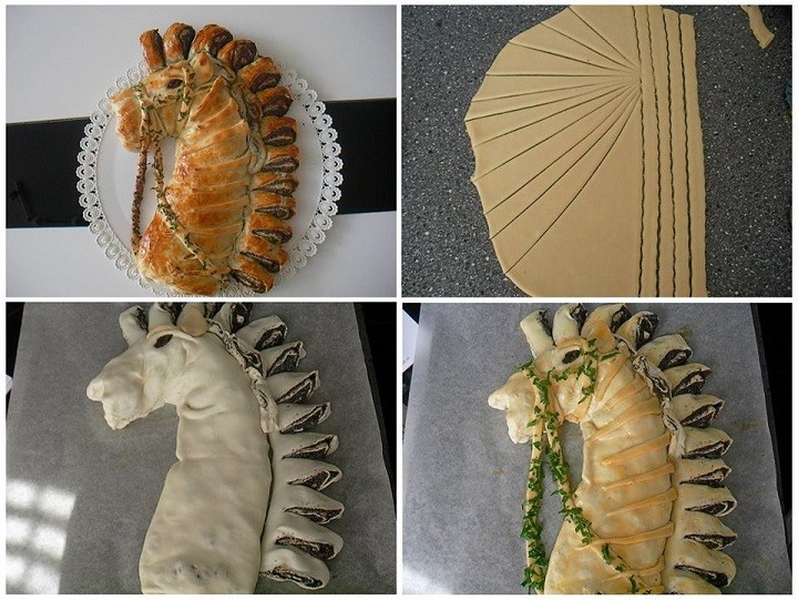 Hozzávalók 500 g leveles tészta a testhez 250 g leveles tészta a sörényhez Kantár, fül, sörény 200 g liszt 2 db tojás (1a tésztába, 1 felverve megkenni a tetejét) 50 ml viz csipet só A hozzávalókat gyúrjuk össze és pihentessük 20 percig a hűtőszekrényben. Vágjuk fel a képen látható módon. A töltelékek szabadon választhatóak. A képen a sörény tölteléke 20 dkg mákból, a test 40 dkg almából készült. Továbbá apróra vágott menta, a kantárt megszórni mazsola, vagy valamilyen aszalt gyümölcs a szemnek Amikor a végén a felvert sárgájával megkenjük a tetejét, akkor a sörény megkenése előtt pici porcukrot keverhetünk a tojáshoz, az ezzel megkent részek sötétebbre barnulnak.