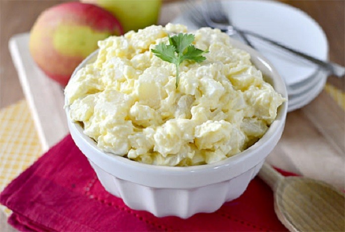 A burgonyát leszűrjük, szitára helyezve jól lecsurgatjuk, majd a mártásba keverjük. Jó, ha fogyasztás előtt 1 órát hűtőszekrényben állni hagyjuk.