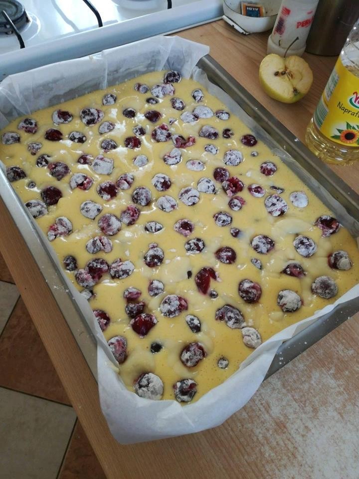 Alig sül ki, már szeleteljük is! Nagyon könnyen és gyorsan elkészül, jól variálható süti. Kerülhet bele meggy helyett cseresznye is, vanília puding helyett csoki, kinek mi van otthon. /Pillanatok alatt elkészíthető, ezért is szeretjük annyira\./