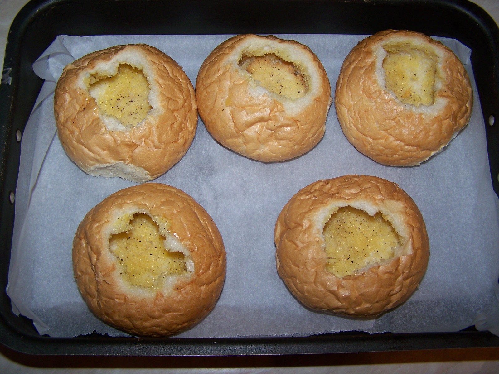 Levágtam a zsemlék tetejét és kiszedtem a belsejét (ezeket kiszárítottam, majd zsemlemorzsát készítettem belőle). Olvasztottam egy kis vajat, ezt sóztam, borsoztam, majd ecset segítségével kikentem a zsemlék belsejét. Sütőpapírral bélelt tepsibe raktam őket.
