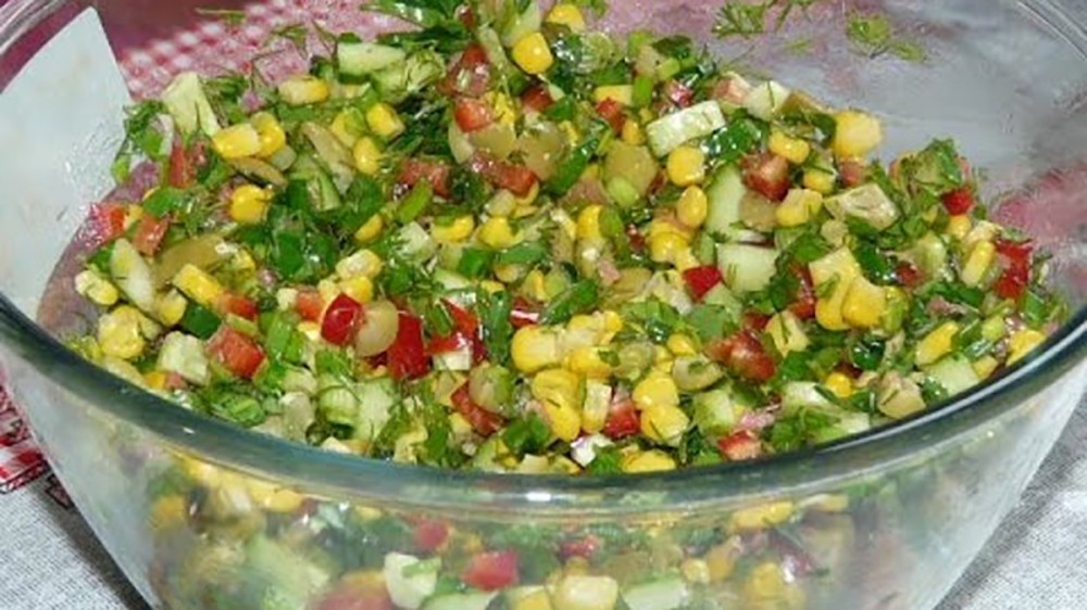 Öntsük le a konzerv kukorica levét, az uborkát és a paprikát vágjuk kockára.