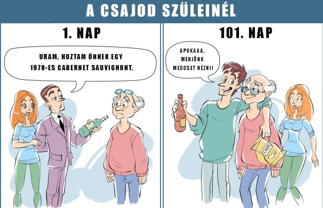 Top 10 keresem az állam és még mindig röhögök, hogy valójában mennyire így van szituáció a hétköznapokból. Mikor először találkozol az apósoddal valahogy megpróbálsz civilizáltan viselkedni szépen felöltözöl és mondjuk viszel egy üveg bort az első bemutatkozós találkára, de mi történik 100 napra rá? Vajon, hogy alakul a viszonyotok? Hasonló a házasélet szépsége is. Újdonsült menyecske süt - főz és úgy várja haza férjecskéjét, de mi történik 100 nap múlva? /és még nyolc röhejesen valódi vicces szitu a mindennapjainkból\./