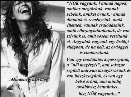 "NŐK vagyunk. Vannak napok, amikor megtörünk, vannak sebeink, amiket óvunk, vannak álmaink és reményeink, amik éltetnek, vannak csalódásaink, amik elbizonytalanítanak, de van szívünk is, amit sosem veszítünk el. Angyalok vagyunk egy ördögi világban, de ha kell, az ördöggel is cimborálunk. Van egy csodálatos képességünk, a "női megérzés", ami sokszor segített már,van kisugárzásunk és van büszkeségünk, és van egy belső erőnk, ami mindig továbbvisz bennünket...hisz NŐK vagyunk..."