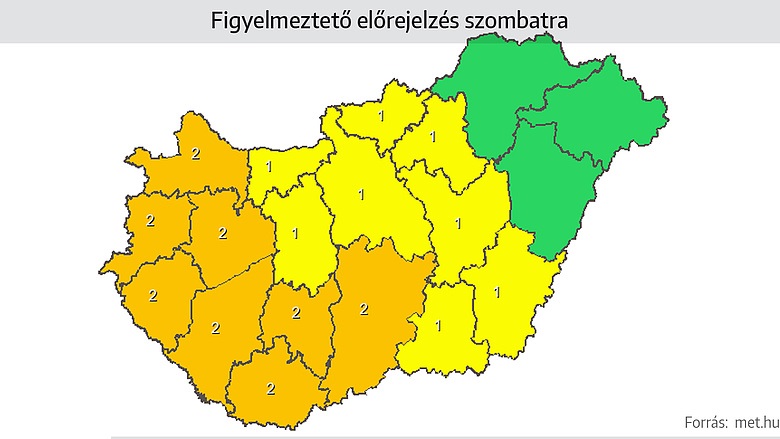 Szombat napközben előbb helyenként (főként a Dunántúlon és a középső megyékben), majd késő délutántól, estétől nyugat, délnyugat felől (ÉK felé helyeződve) egyre több helyen várható zivatar (késő estig legkisebb valószínűséggel ÉK-en). Heves zivatarra is van esély, amelyet viharos vagy károkozó szélroham (60-90, néhol > 90 km/h), nagyobb méretű jég (> 2-3 cm) és felhőszakadás (> 25-30 mm) kísérhet.