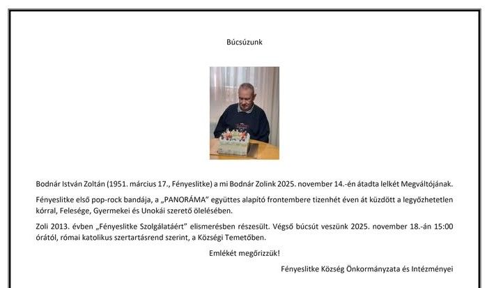 /Mély megrendüléssel búcsúzik Fényeslitke közössége Bodnár István Zoltántól, a település első pop–rock zenekarának, a Panoráma együttesnek alapító frontemberétől\./