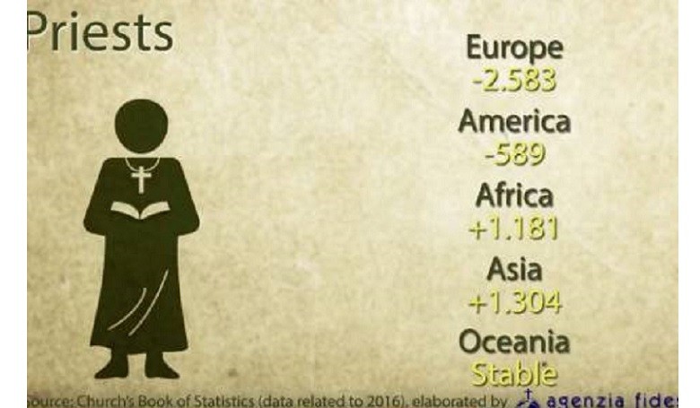 A világban szolgáló papok száma is csökkent 2015 és 2016 között, a számuk 414,969 fő. Az egy papra eső hívek száma a felmérés szerint 3,130 fő.