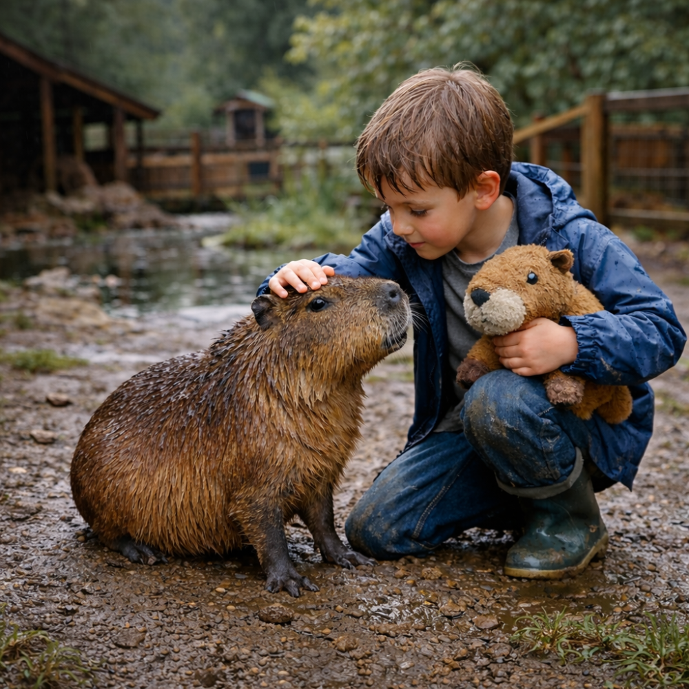 A csoport közepén egy csendes, nagy szemű kisfiú lépdelt, kezében egy megviselt plüssfigura. Egy capybara. Koszos volt, kissé megkopott, az egyik lába már csáléra állt, de a fiú úgy szorította magához, mintha a világ legdrágább kincse lenne.
