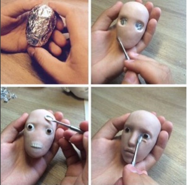 Mégis érdekes látni, ahogy egy arc alufóliával készül. Maga a fej anyaga “polimer agyag”, amely megkeményedik a sütőben.