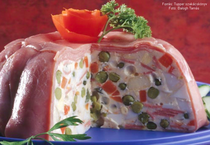 Kevergetve éppen csak 1 percig forraljuk, amíg föloldódik. Langyosra hűtjük, majd a majonézes mártással összekeverjük, az előkészített hozzávalókra öntjük. Összekeverjük, azután a sonkával bélelt tálba öntjük. Elsimítjuk, a tetejére is rakhatunk sonkaszeleteket, s hűtőszekrényben dermedni hagyjuk. 5. Tálaláskor a formát néhány pillanatra meleg vízbe állítjuk, majd tartalmát vágódeszkára borítjuk. Forró vízbe mártott késsel cikkekre vágjuk.