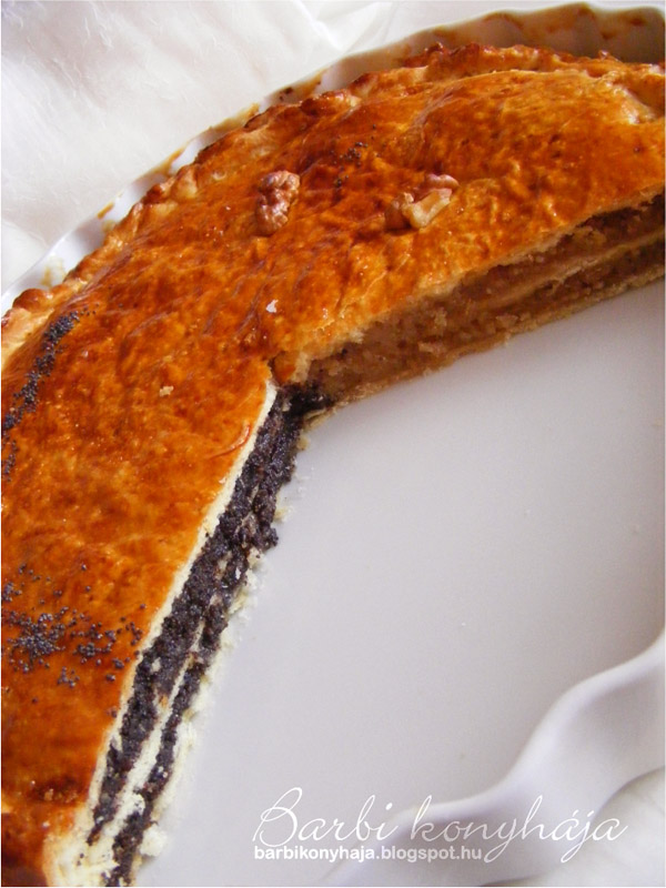 Lisztezett deszkán vékonyra kinyújtjuk az egyik tésztát, kicsit nagyobbra, hogy majd be tudjuk vele keretezni a piténket. Béleljük ki vele a forma alját, majd egyik felére rákenjük a mákos töltelék felét, a másik felére pedig a diós töltelék felét.
